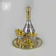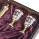 Сдержанная роскошь, элегантность и изысканность – такие мысли возникают при взгляде на этот серебряный водочный набор. В него входят графин на 300 мл, три рюмки по 35 мл и поднос круглой формы. Изящная форма графина и рюмок дополняется сложным дизайном: позолота гармонично сочетается с гравировкой, чернью и полировкой. Все вместе создает насыщенный и роскошный узор, делая сервиз достойным произведением кубачинского ювелирного искусства.