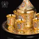 Серебряный водочный сервиз станет роскошным украшением торжественного обеда как в домашних, так и официальных рамках. Посмотрите на изумительный дизайн графина, четырех стопок и подноса: солнечная позолота искусно сочетается со вставками из цветной горячей эмали, гравировкой и полировкой. Сложный и богатый орнамент вызывает восхищение мастерством ювелира, создавшего изящную форму изделий и виртуозно их украсившего.